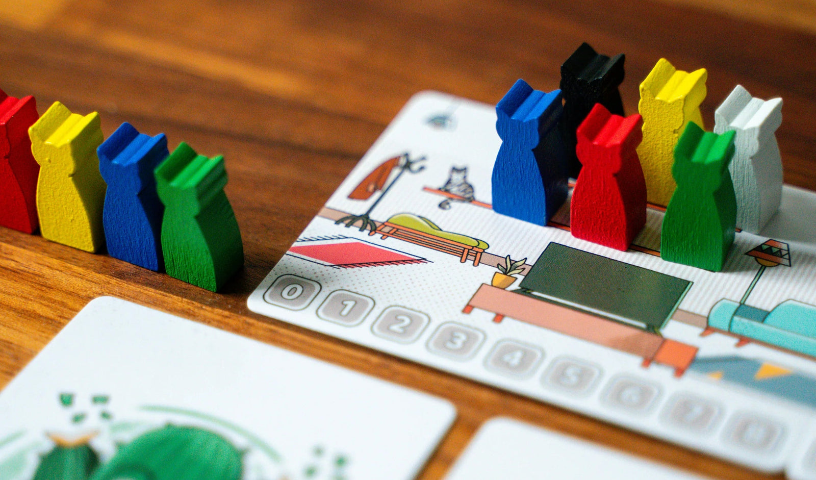 The action kicks off with the player who triumphed in the previous round. One by one, players will strategically play their cards beneath six laid-out items on the table until each item has two cards. The total value of these two cards represents the worth of the item. Players then tally up the values of the items remaining in their hands to figure out their placement on the track. The ultimate objective? Get your token as close to the cat as possible without surpassing it! And remember, there can be multiple winners in a round! If everyone passes the cat, the player who did so least takes the crown.