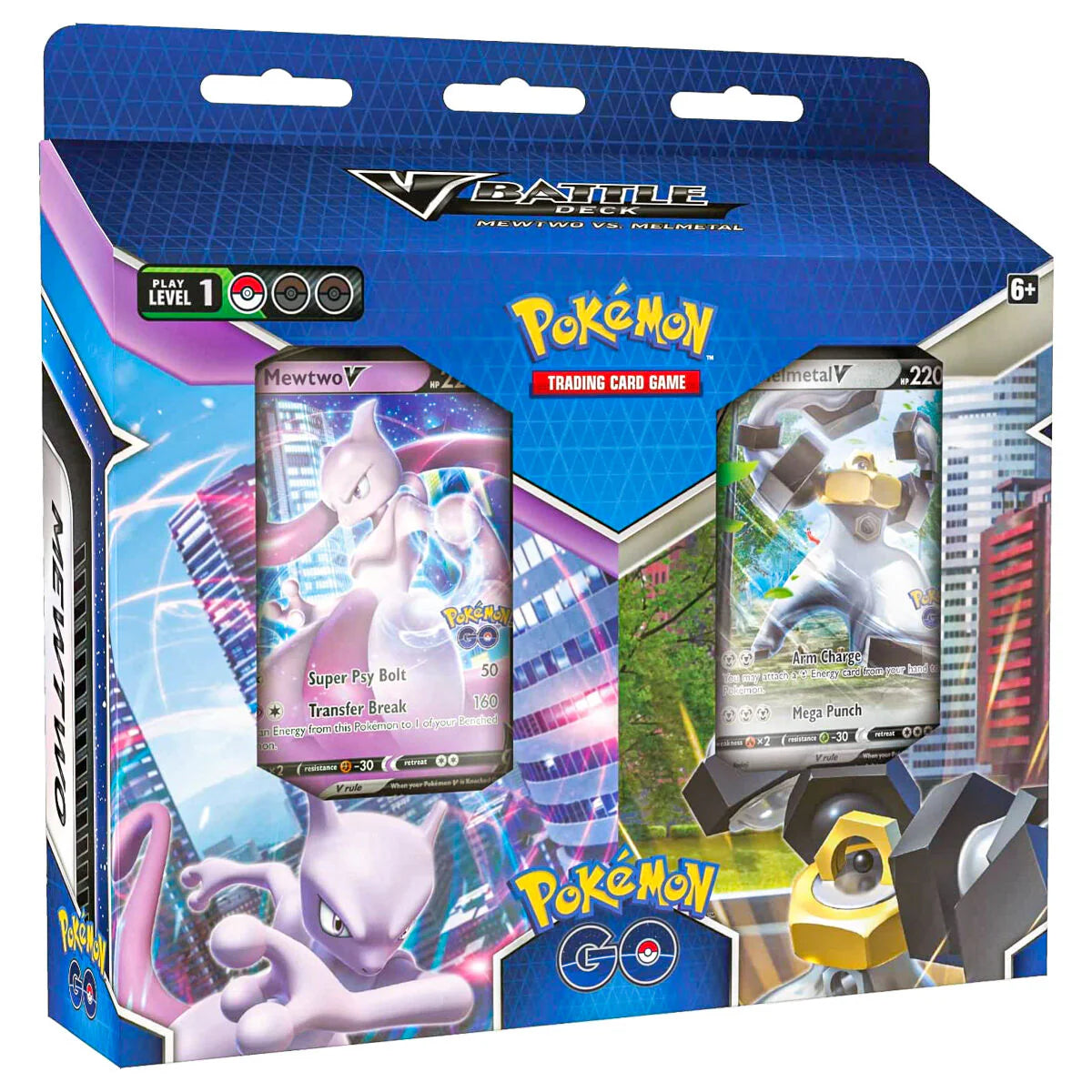 Unleash mental might or metal mayhem with a deck led by Mewtwo V or Melmetal V with Pokémon TCG: Pokémon GO V Battle Deck Bundle. Mewtwo V leads an elusive team of Psychic-type Pokémon, while Melmetal V brings the crushing power of Metal types. Land quick hits turn after turn, keep Energy in play, and master all the tricks of these two V Battle Decks!